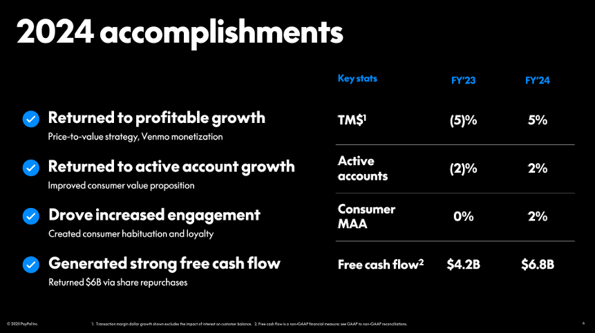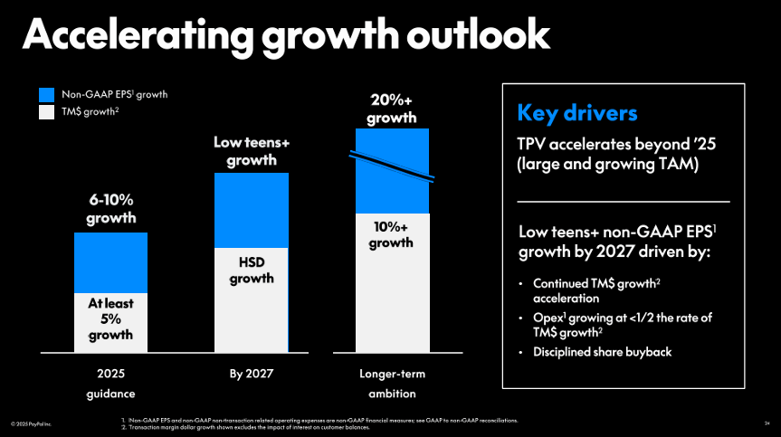 CEO Alex Chriss has made it clear that PayPal is shifting focus toward profitable growth. This includes moving away from unprofitable Braintree contracts, which is expected to lift transaction margin dollars by 1% YoY in 2025. However, this shift comes with a ~5% headwind to revenue growth, as explained by CFO Jamie Miller.